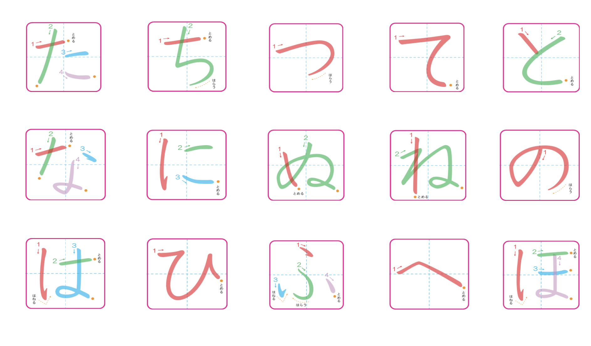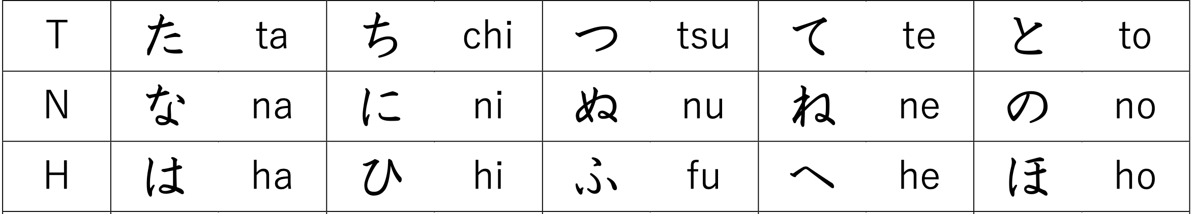 ひらがな(た行、な行、は行)を おぼえしょう。Let's learn the hiragana ("ta" column "na" column "ha" column ).