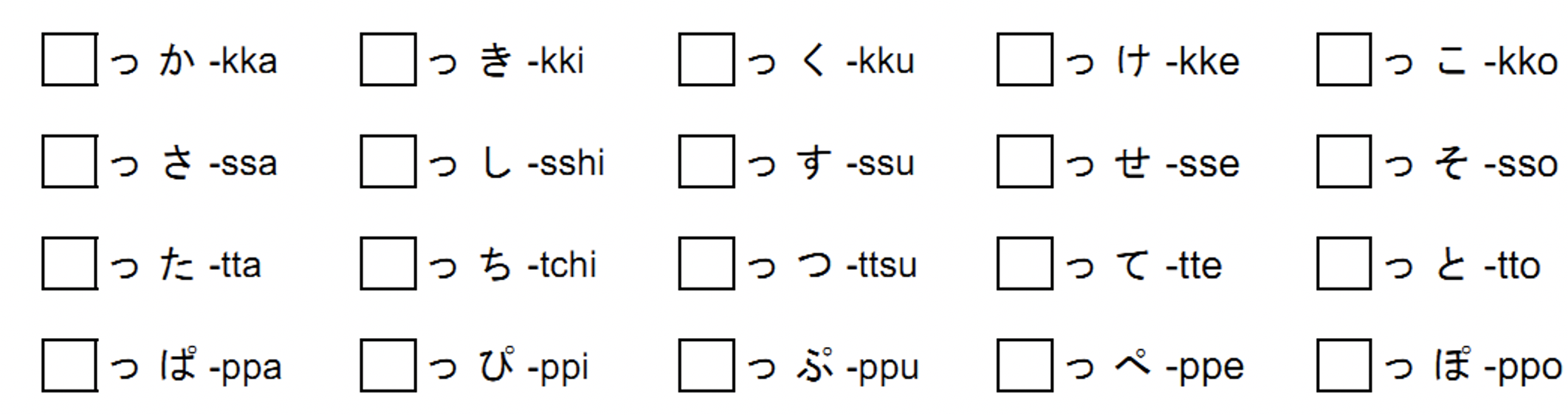 っか -kka っき -kki っく -kku っけ -kke っこ -kko